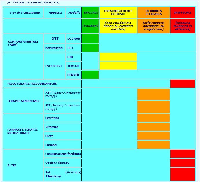 Nel “Il trattamento dei disturbi dello spettro autistico nei bambini e negli adolescenti” documento redatto dall’Istituto Superiore della Sanità nell’Ottobre del 2011 vengono esposti gli studi effettuati per ogni tipo di trattamento proposto e classificati in termini di efficacia.